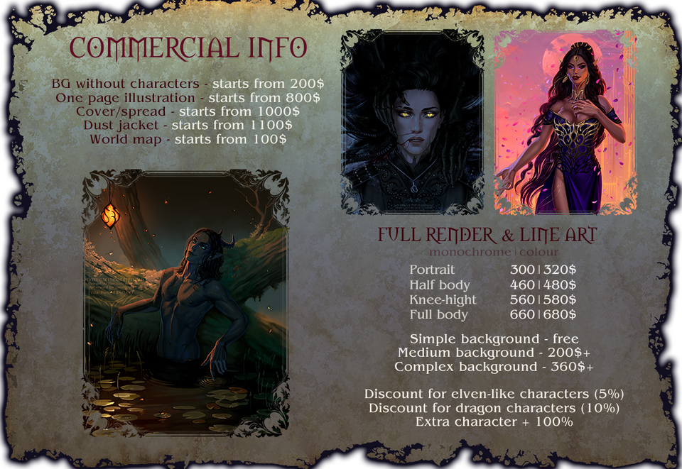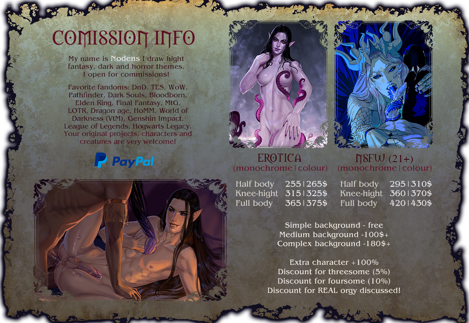 π All options from SFW commissionsBy paying for a commercial order, you receive all copyrights to the final image, the ability to sell and distribute products. BUT turning commercial artwork into NFT is forbidden. I forbid using any of my art for any doings with the help of AI and neural networks.Contact me on [email protected], discord (Nodens) or private message on Twitter, BlyeSky. I am ready to help you with all questions and price clarification!